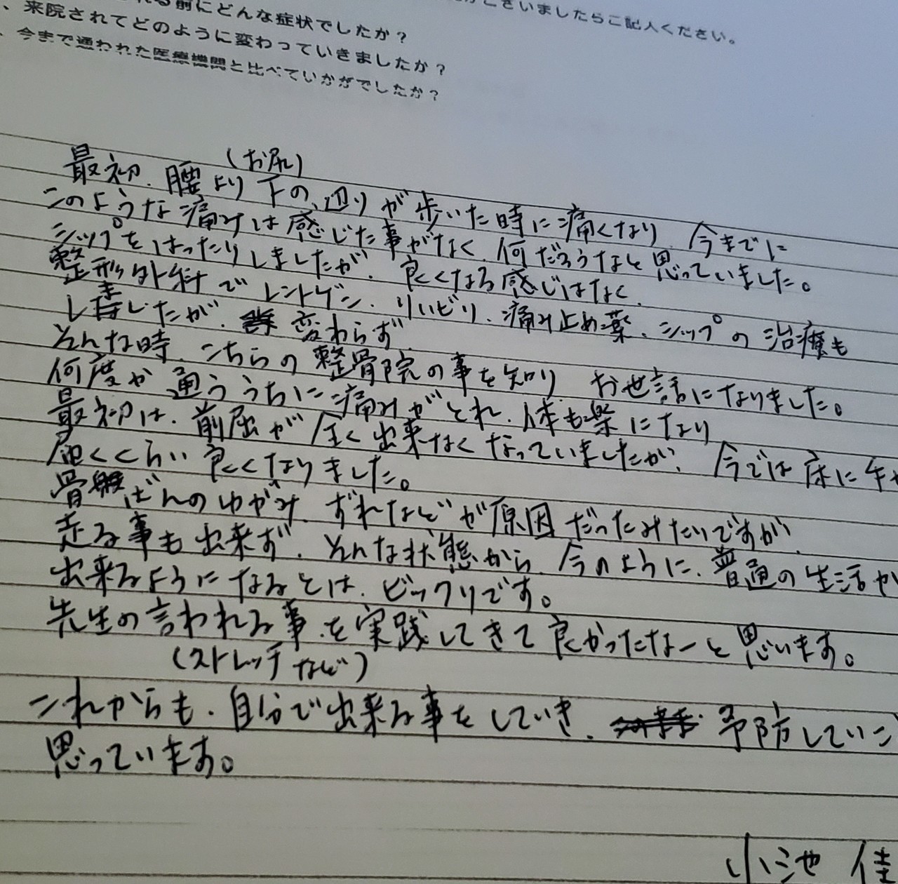 シップをはったりしましたが良くなる感じはなく整形外科でレントゲン、リハビリ、痛み止め薬、シップの治療もしましたが変わらず、そんな時にこちらの整骨院の事を知りお世話になりました。