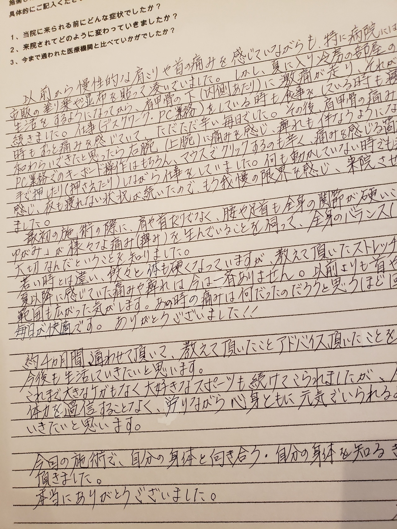 あの時の痛みは何だったんだろうと思うほど回復して今は毎日が快適です。ありがとうございました。約4カ月間通わせて頂いて、教えて頂いたこと、アドバイス頂いたことを意識して今後も生活していきたいと思います。これまで大きなケガもなく、大好きなスポーツも続けてこられましたが、今後は自分の体力を過信することなく、労わりながら心身ともに元気でいられるよう努めていきたいと思います。