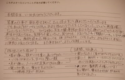 今回の施術で自分の身体と向き合う、自分の身体を知るきっかけを頂きました。本当にありがとうございました。