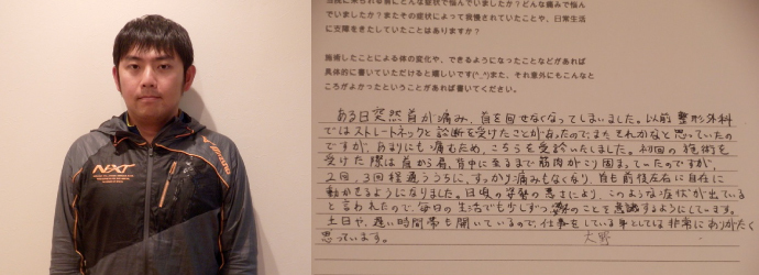 初回の施術を受けた際は首から肩・背中に至るまで筋肉がコリ固まっていたのですが、2回・3回ほど通ううちに、すっかり痛みもなくなり、首も前後左右に自在に動かせるようになりました。