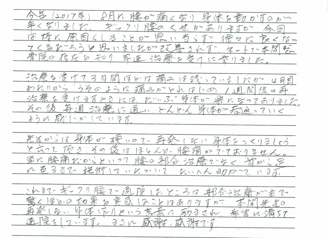 ギックリ腰のくせがありますが、今回は原因らしいことが思い当たらず、徐々に良くなってくるだろうと思いましたが改善されず、ネットで本間整体院の存在を知り、早速、治療を受けに参りました。